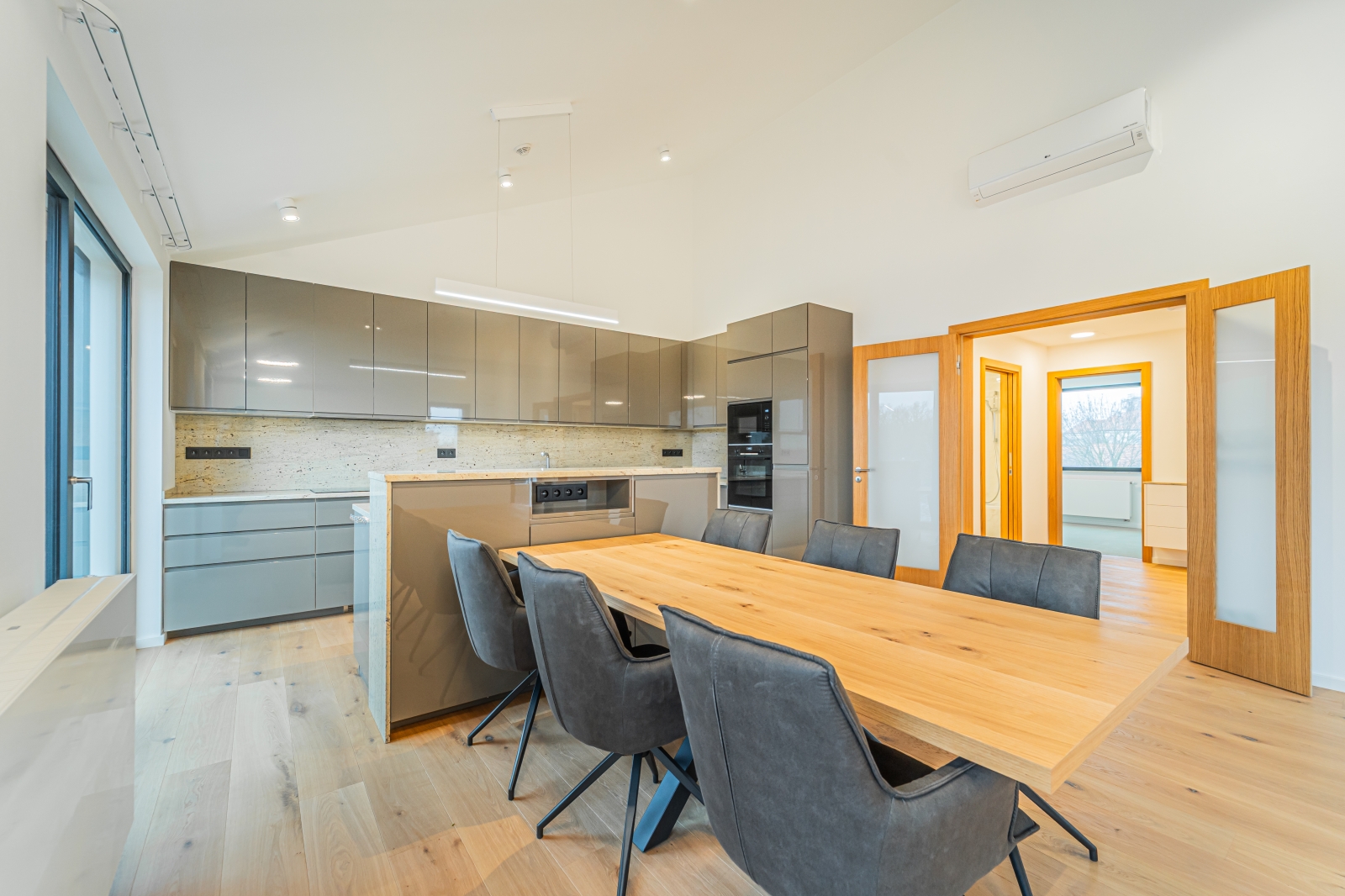 Byt je vybaven novou kuchyňskou linkou na míru včetně spotřebičů Bosch, klimatizací, zabezpečovacím alarmem a vestavěnými skříněmi. Součástí pronájmu je sklepní kóje a jedno venkovní parkovací stání. V domě je k dispozici společná místnost s pračkou a sušičkou.
